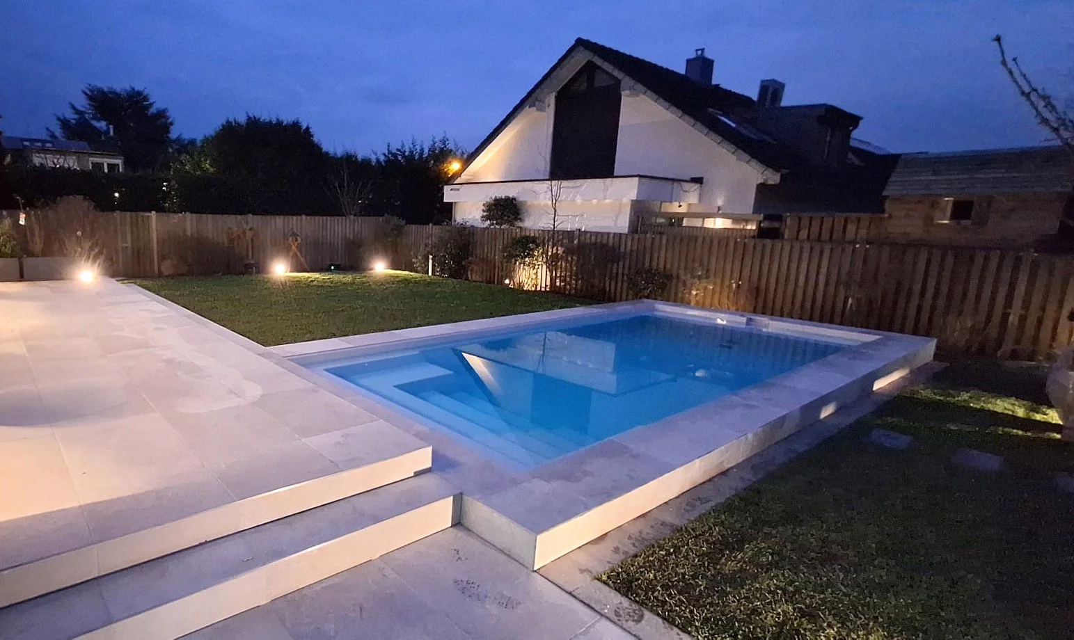 Terrasse, Außenpool, Bepflanzung, Beleuchtung und Bewässerungssystem -